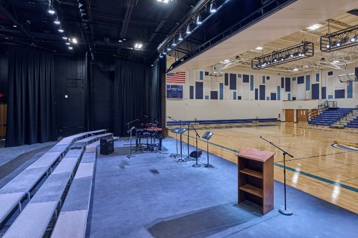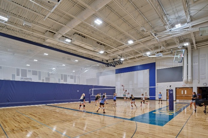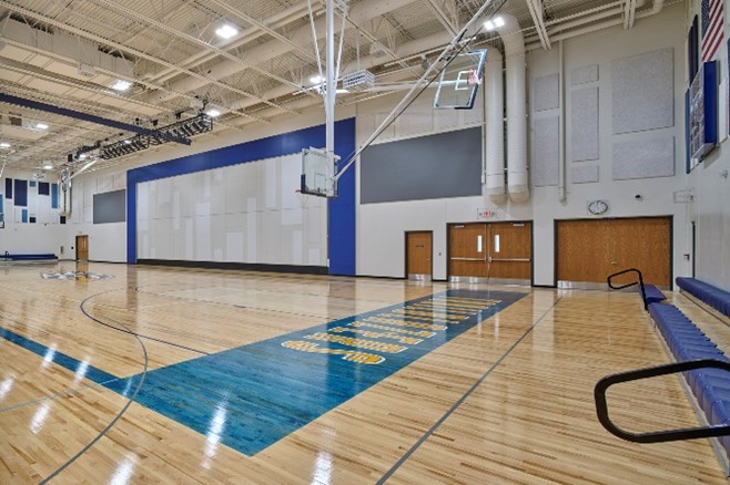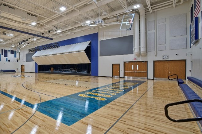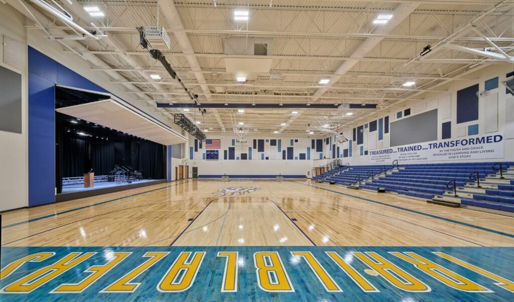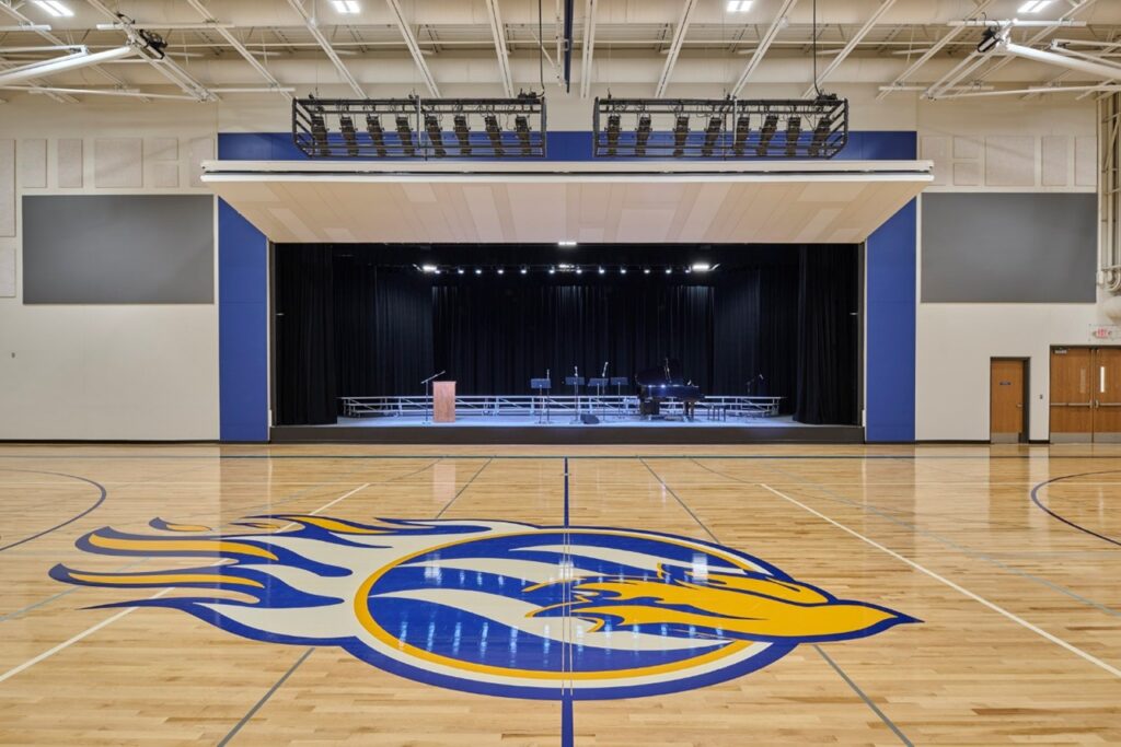 The result is a true “gymatorium” that balances durability and performance while ensuring the best return on investment for both the school and its donors. One of the key design elements that sets this gymatorium apart is the use of a hangar door as the stage door. Typically used in airplane hangars, this innovative solution allows for sound separation while remaining easy to operate and visually striking. Acoustic wall treatments are designed to withstand the rigors of a gym while evoking the feel of an auditorium. Theatrical lighting is retractable, controllable, and well-protected, paired with perches for manual spotlighting when needed.