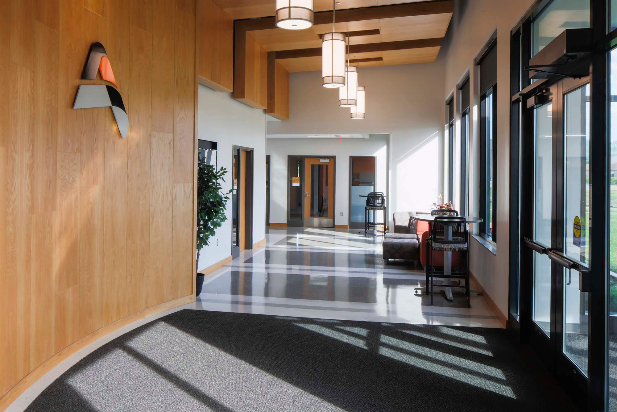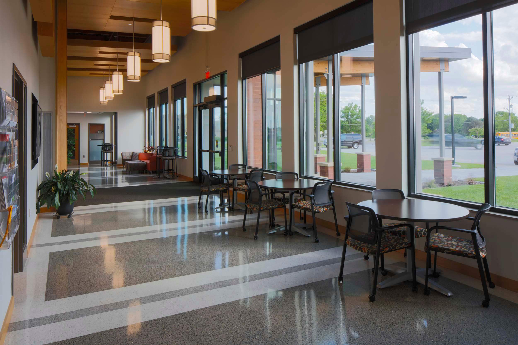 It was the desire of the administrative team and the school board to design a building that was sensitive to the built environment of the adjacent neighborhood. The administration building is placed parallel to the railroad tracks to make the site open and inviting. Choosing a material palette that reflects materials of the neighborhood maintains a design connection to the adjacent houses and buildings.
