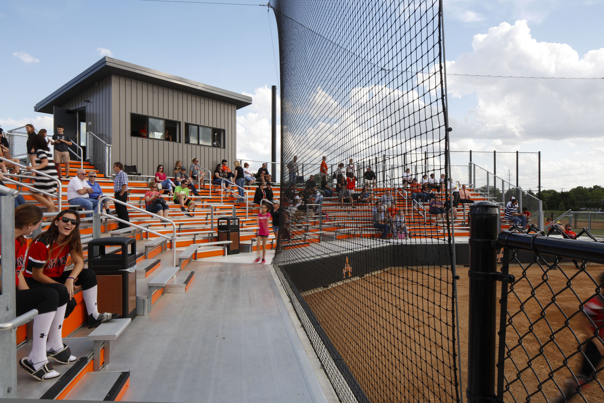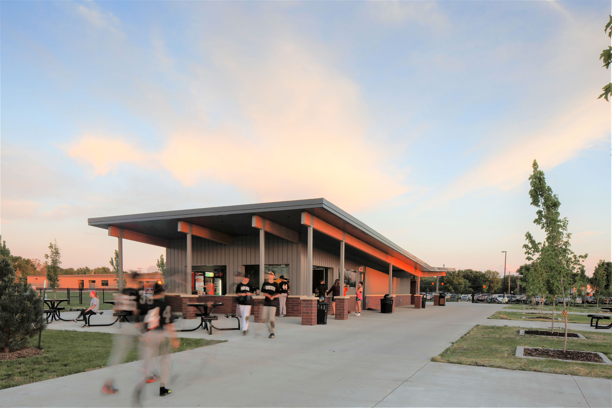The athletic support buildings include concessions, restrooms, press boxes, storage and plaza features were constructed from the same material palette as the administration building, adding a layer of cohesiveness to the built elements found on the site. Landscaping on site was accomplished through the use of earthen berms, trees and shrubs to provide screening and shade.