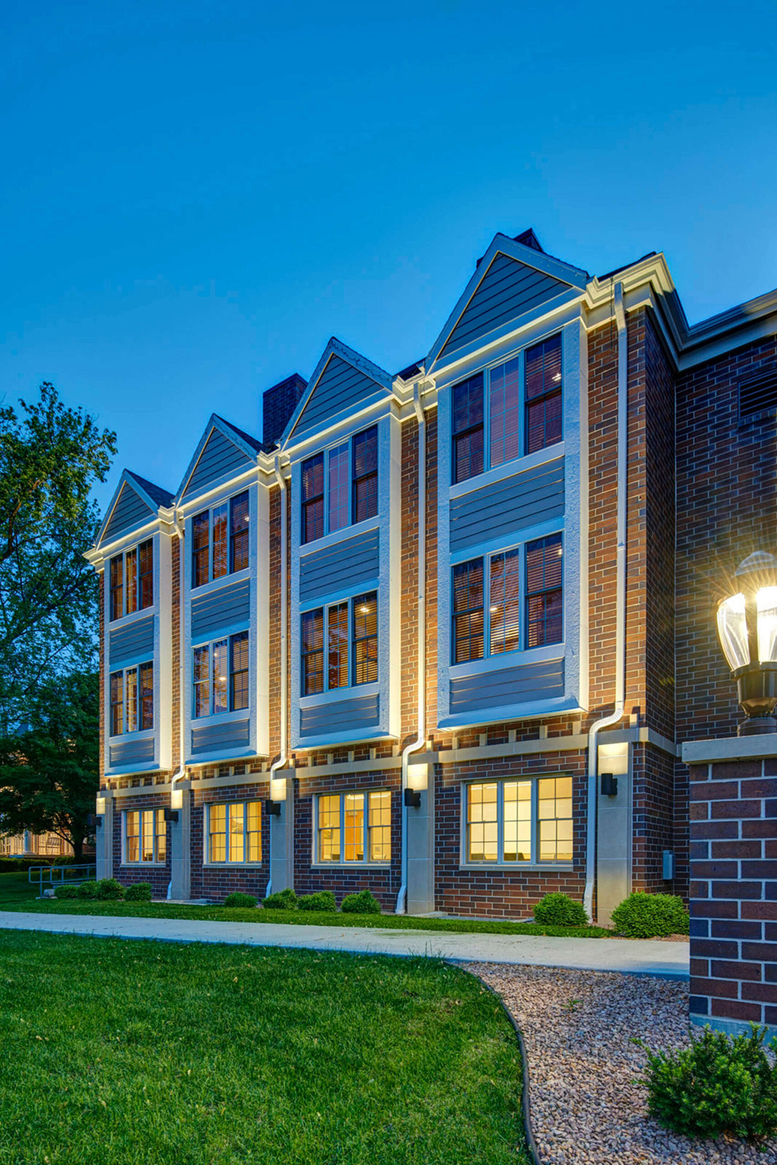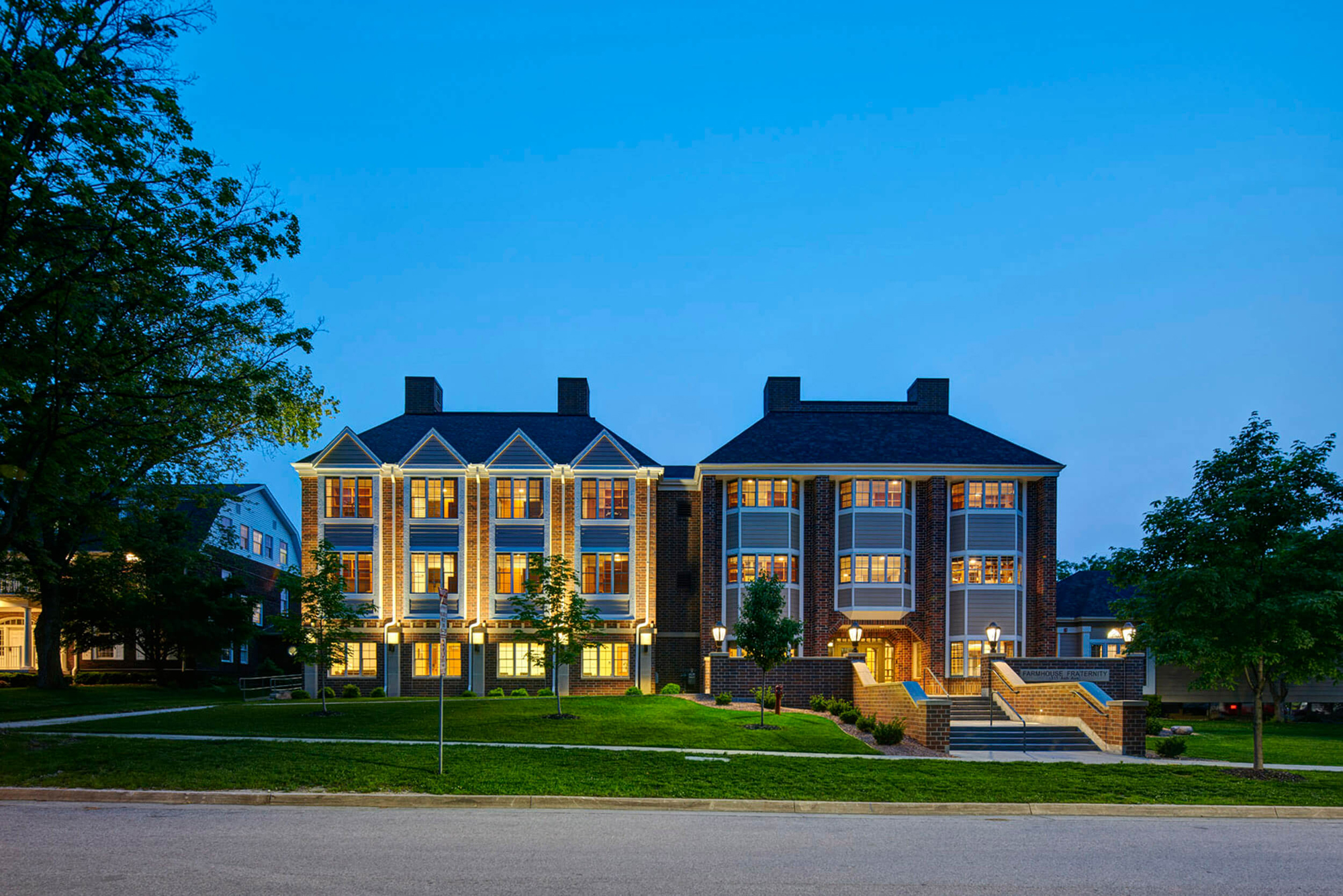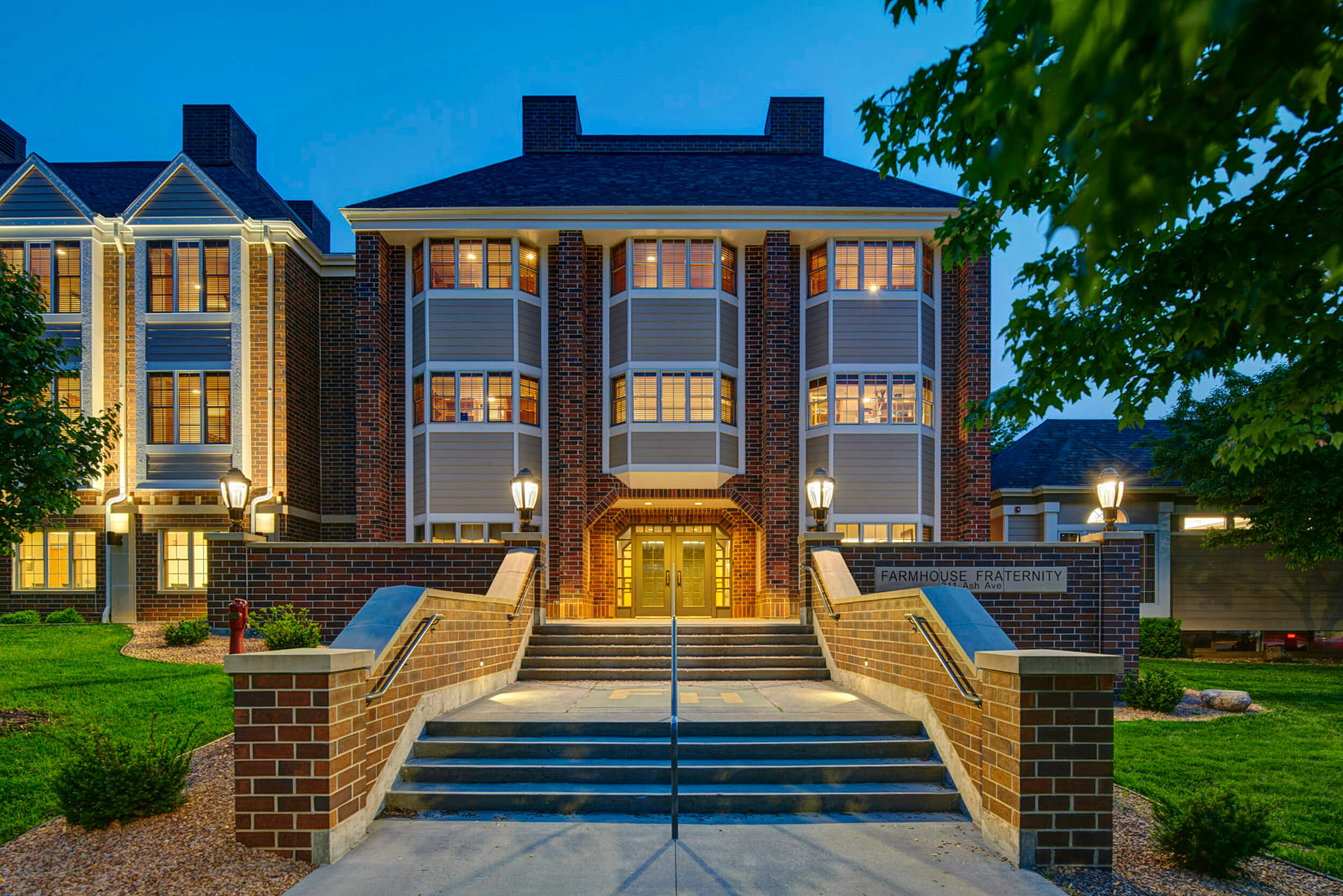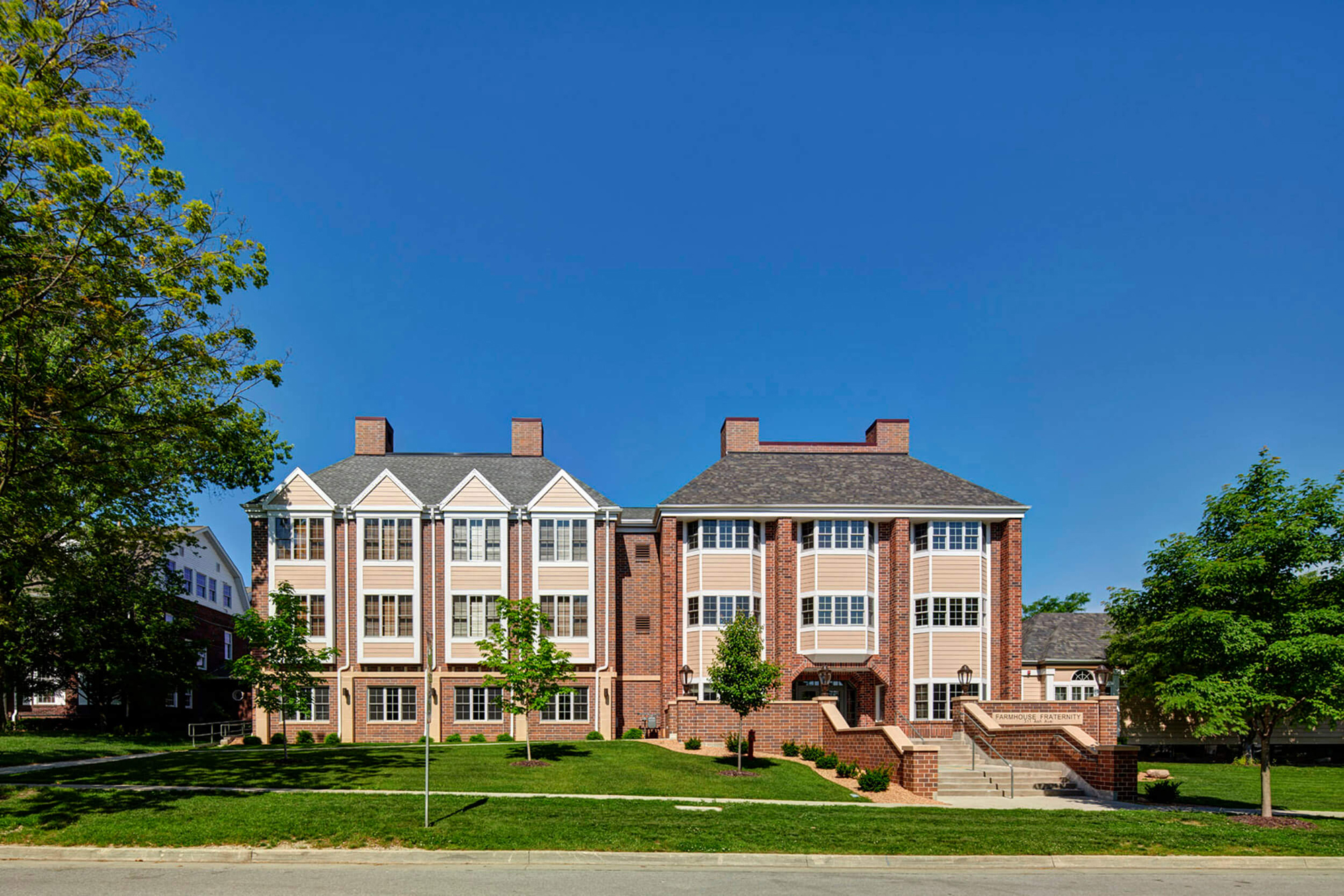 FarmHouse Fraternity at Iowa State University sought to increase the size of the chapter house to handle growth and demand. Each aspect of the expansion and renovation project was carefully crafted to enhance the four-fold development of the young men in the chapter. The four developments include Intellectual, Social/Moral, Spiritual and Physical well-being. The project includes additions and renovations to private study rooms, team study rooms, recreation areas, chapel, library, conference room, dining areas, and front and rear plaza areas. All of these improvements enhance social interaction, mentorship, physical activity, academic rigor, personal responsibility and accountability, and spiritual wellness.