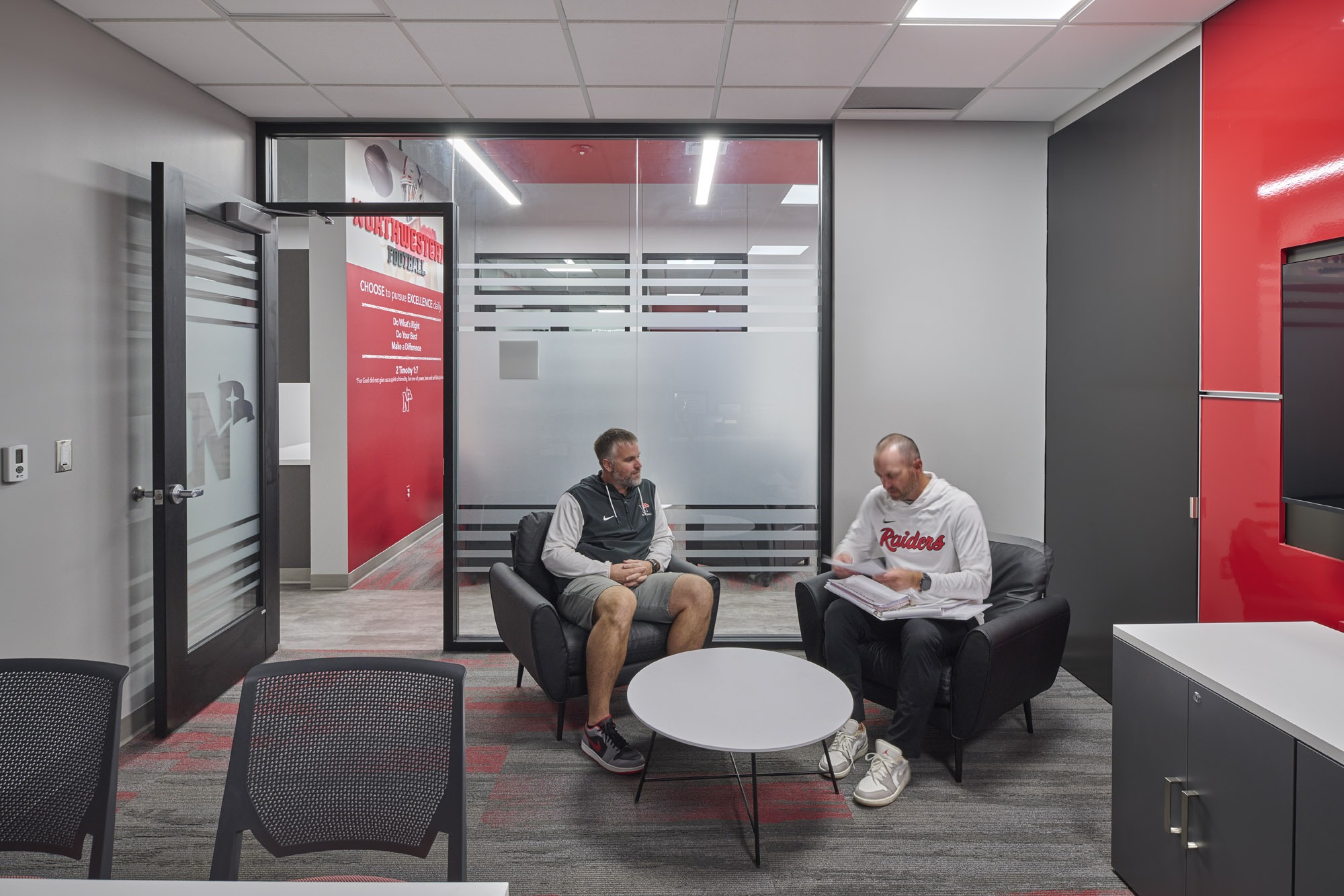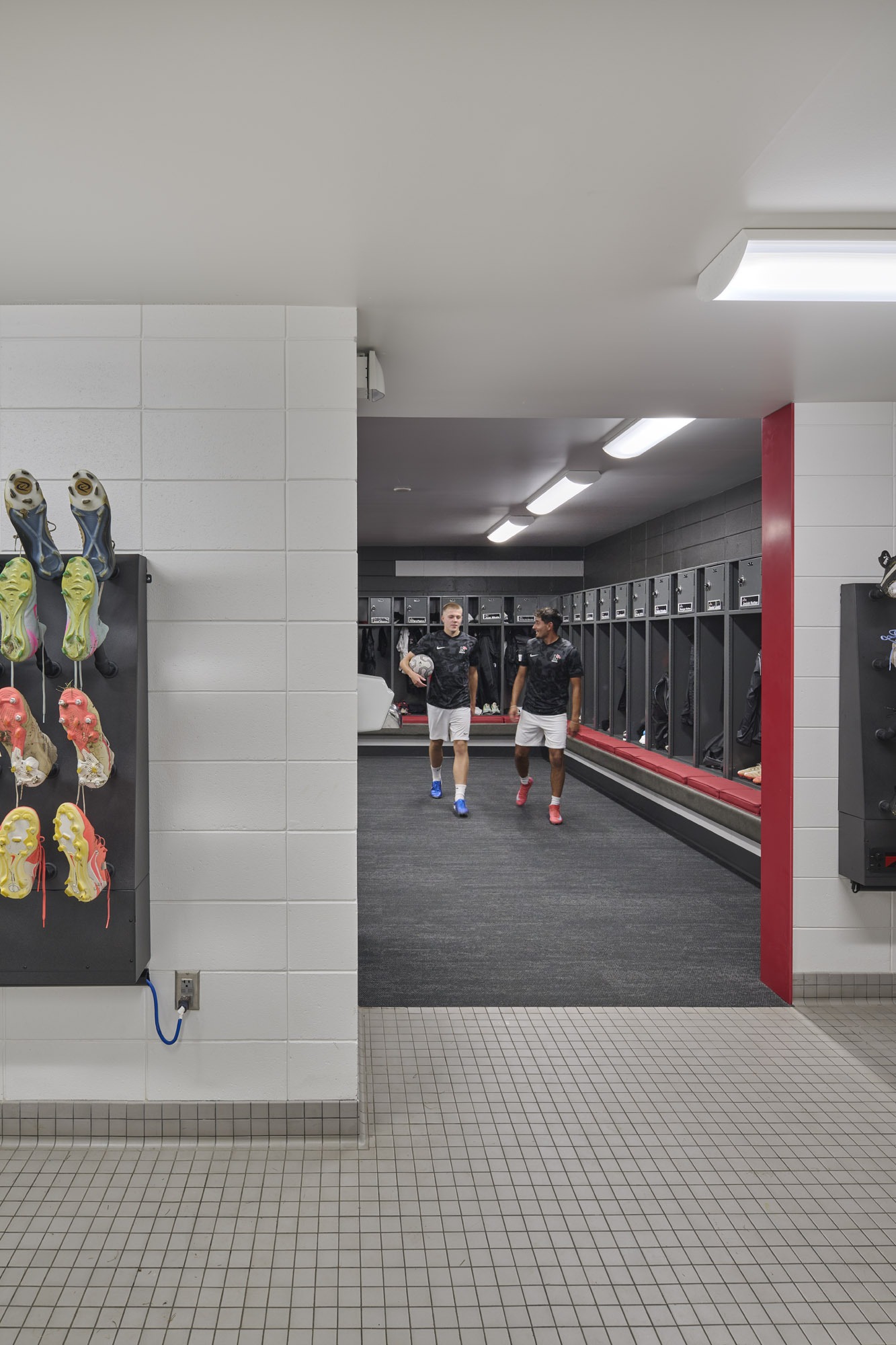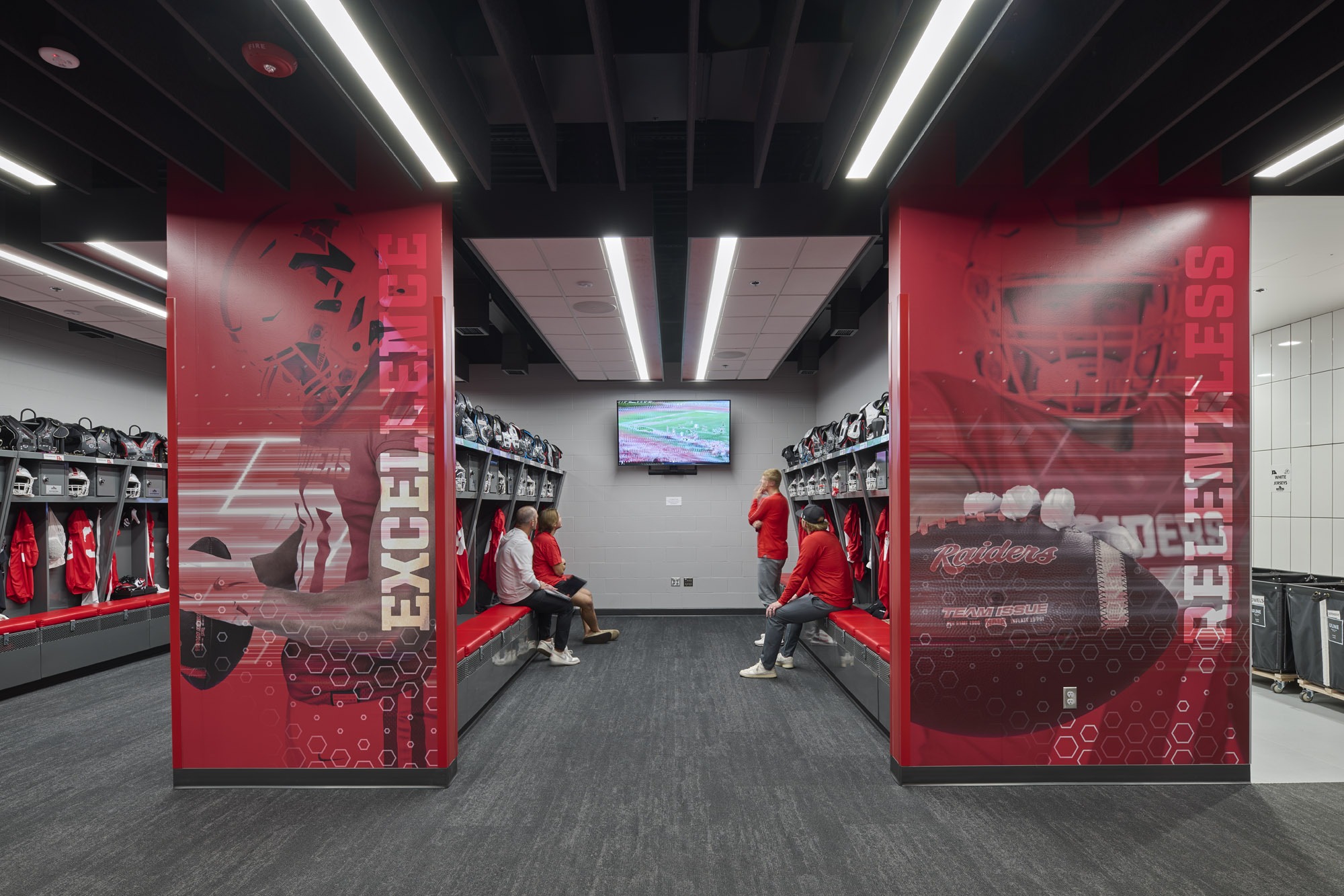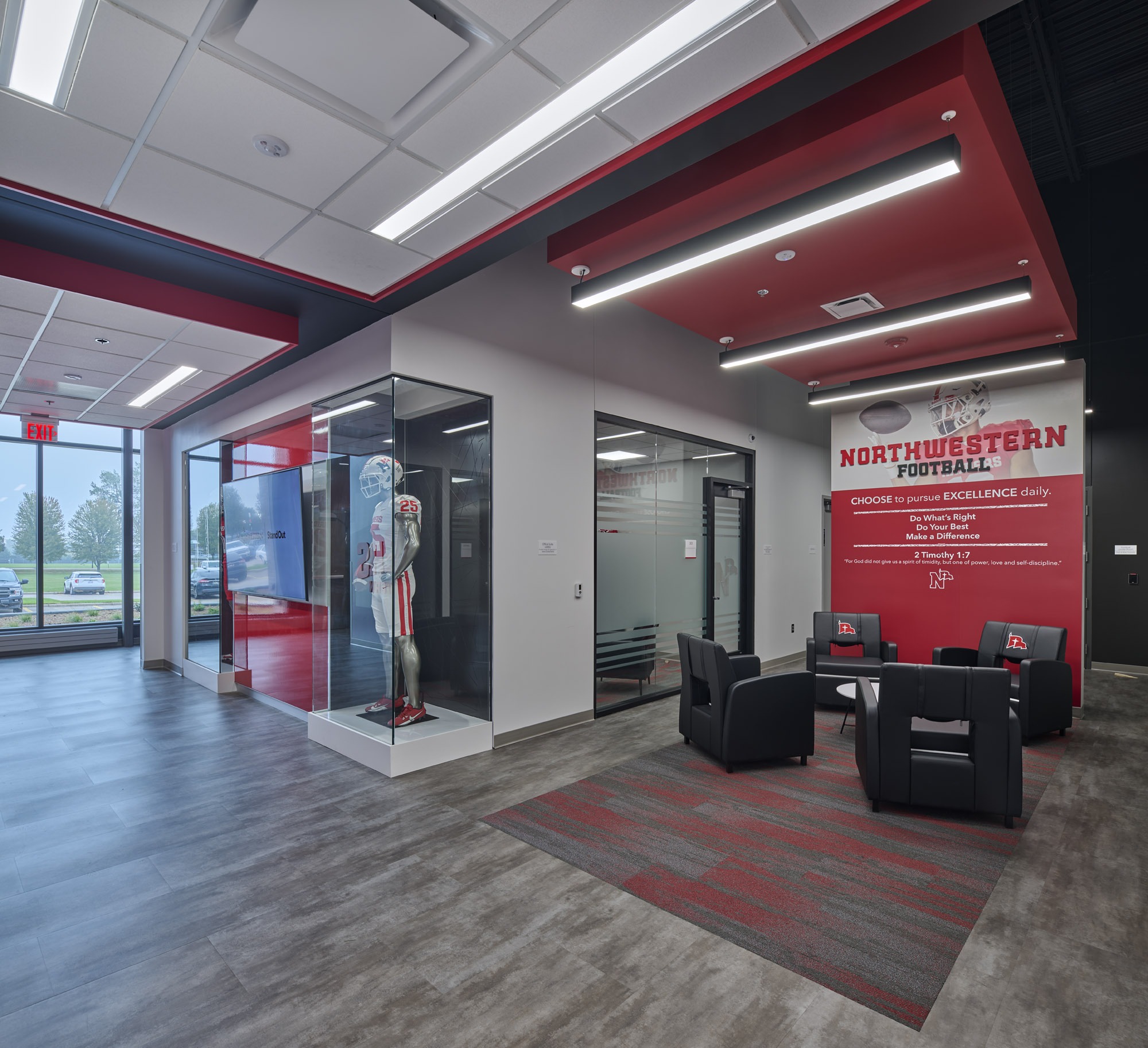 The building addition houses the football locker room, team room, and football coaching suite. Renovated spaces include basketball, soccer, softball, baseball, and volleyball locker rooms as well as the creation of a visitor changing room and finish upgrades to the athletic training room. The design solution focuses on efficiency of space utilization while showcasing the Raider identity throughout the project with vivid graphics and signage. The expanded and updated spaces provide each student athlete with a dedicated locker and home locker room, strengthen the recruiting process, support coaching and staff needs, and illustrate Northwestern College’s devotion to the student experience.