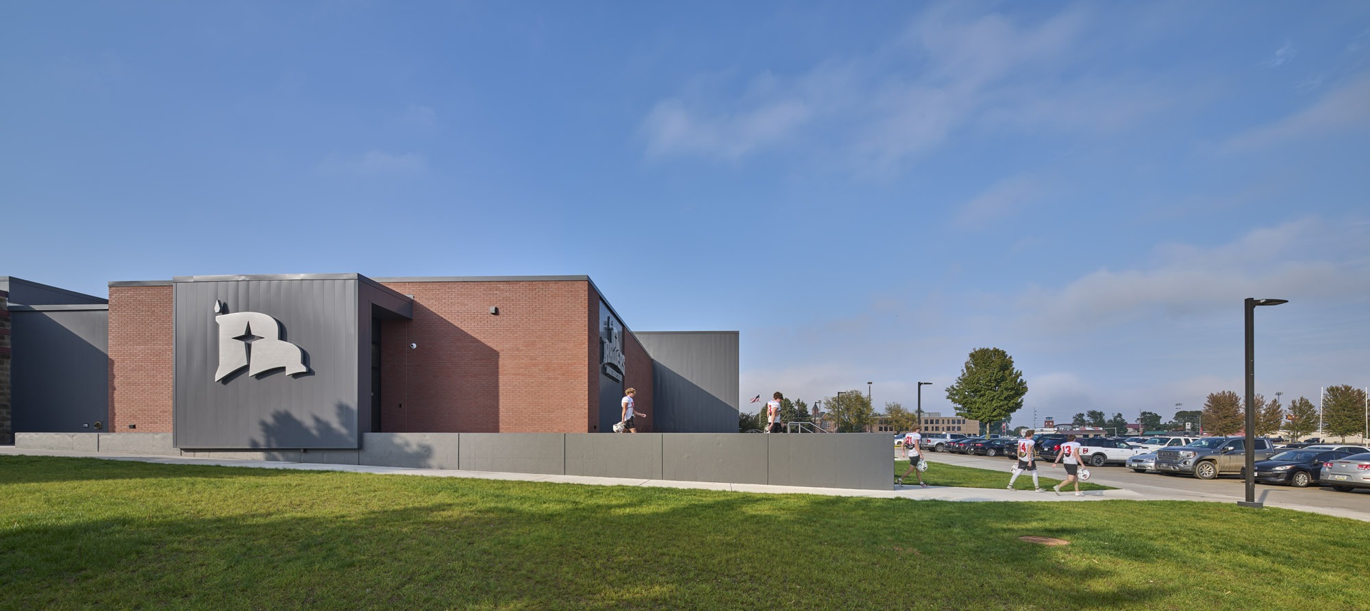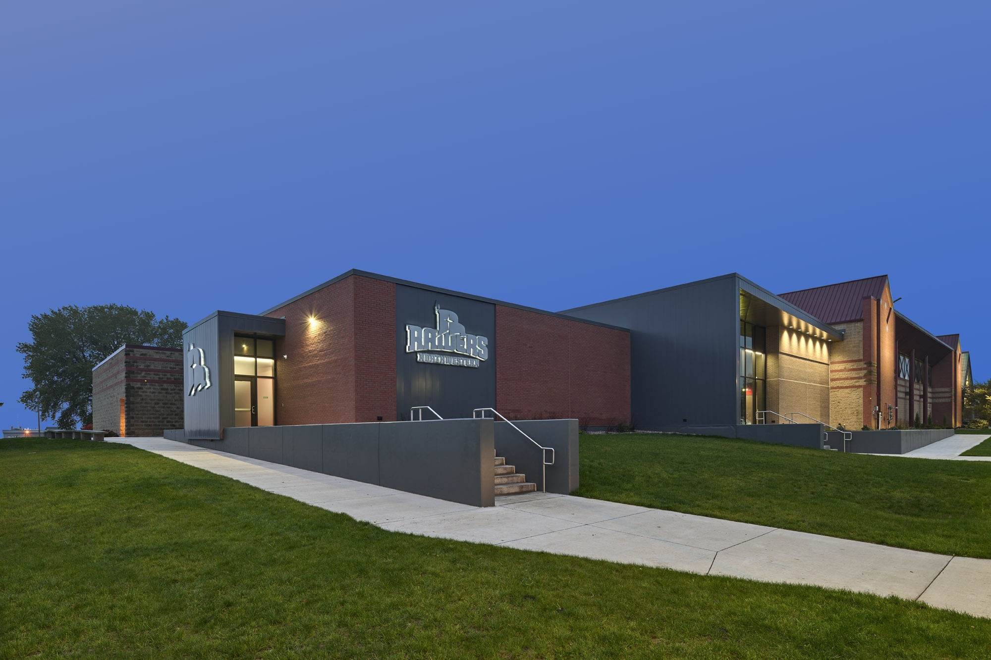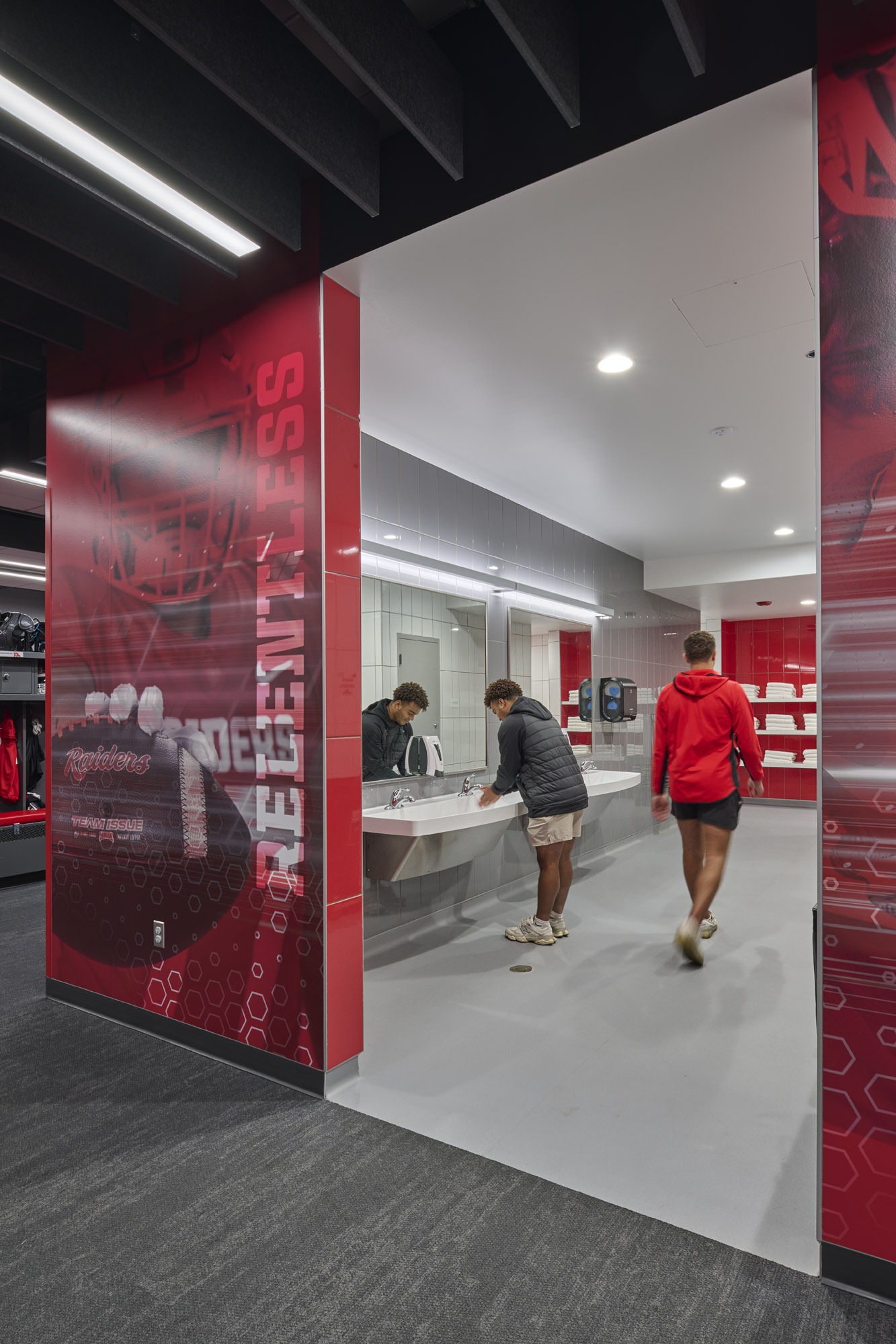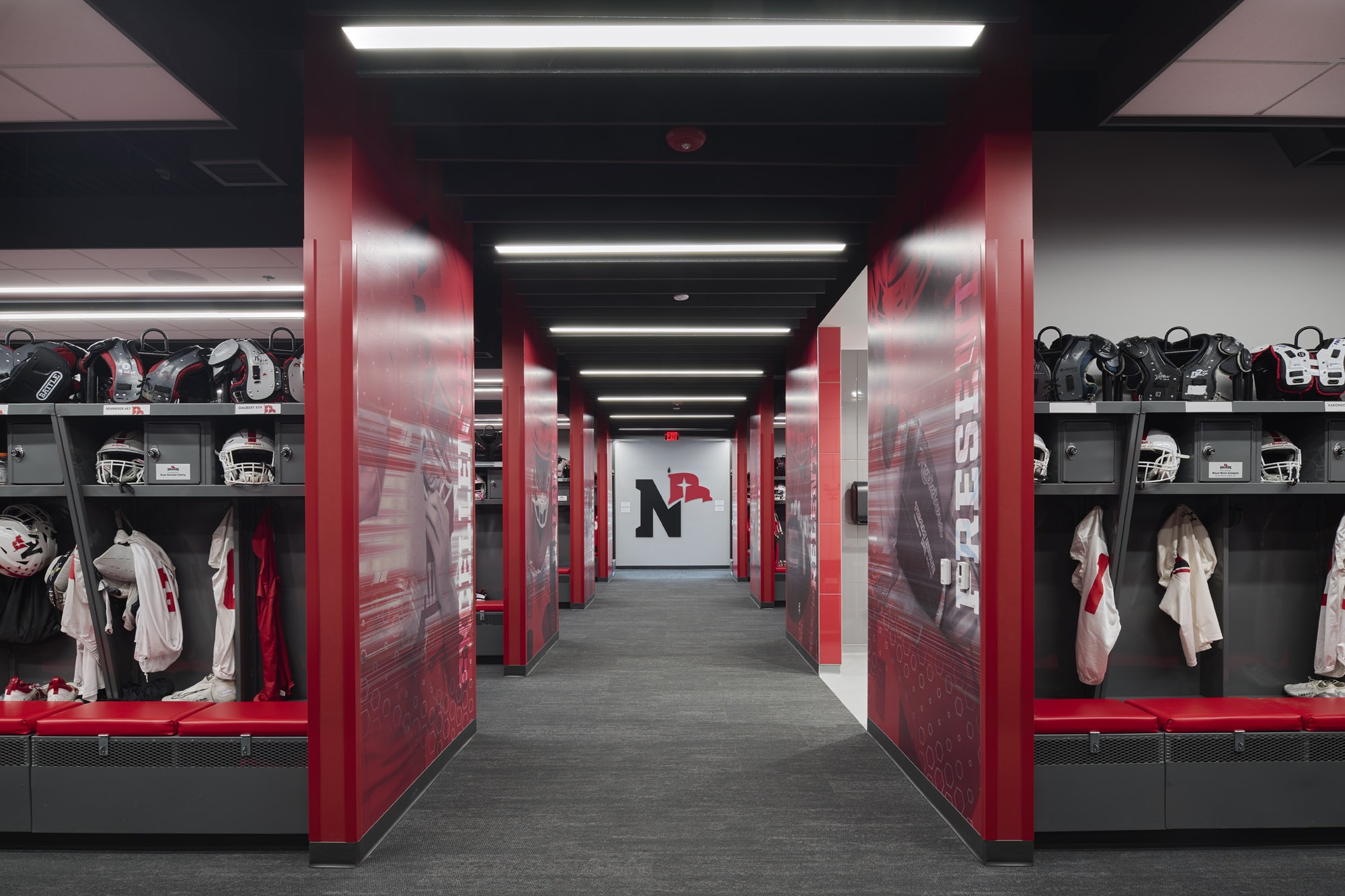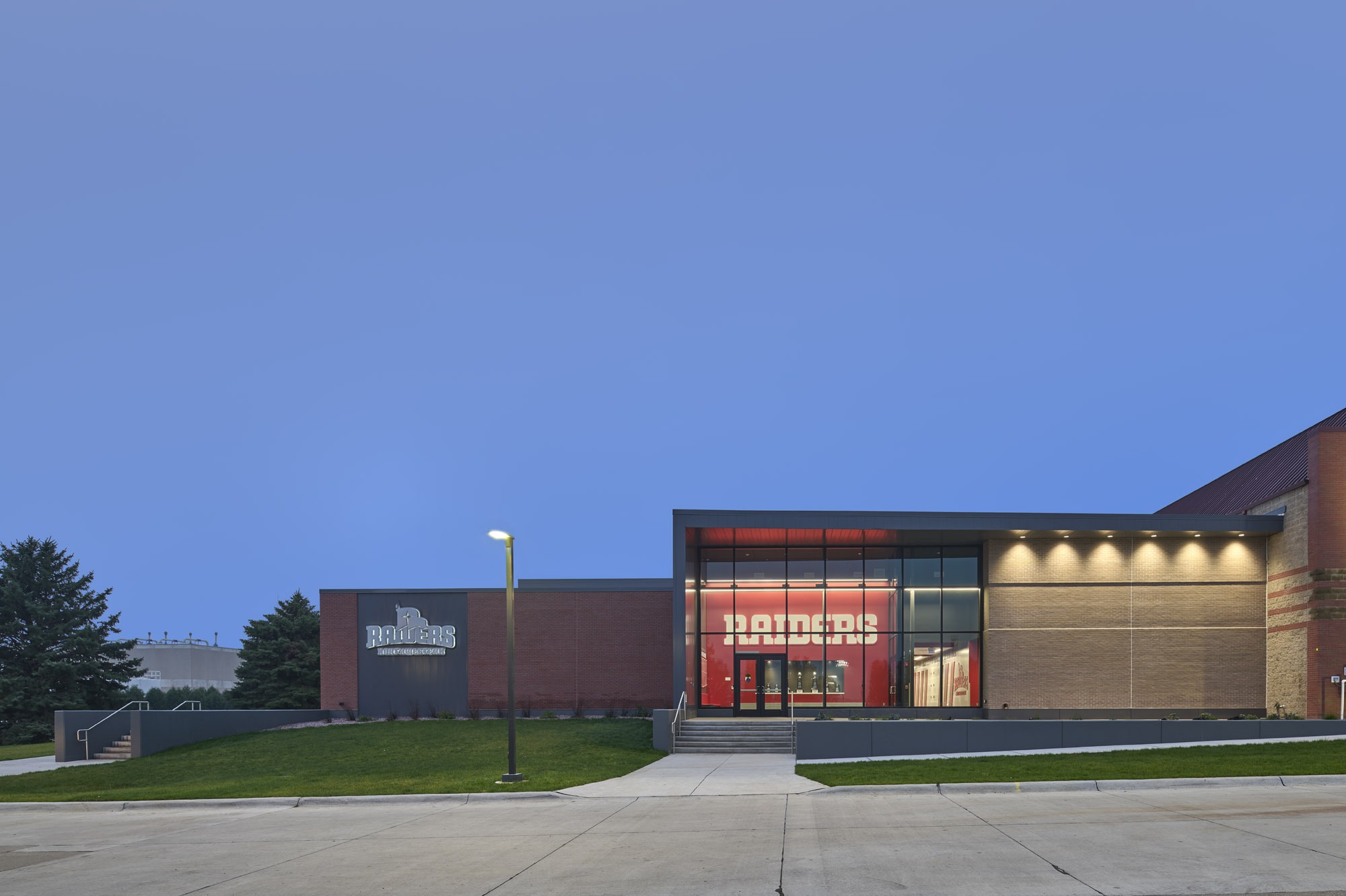 The building addition houses the football locker room, team room, and football coaching suite. Renovated spaces include basketball, soccer, softball, baseball, and volleyball locker rooms as well as the creation of a visitor changing room and finish upgrades to the athletic training room. The design solution focuses on efficiency of space utilization while showcasing the Raider identity throughout the project with vivid graphics and signage. The expanded and updated spaces provide each student athlete with a dedicated locker and home locker room, strengthen the recruiting process, support coaching and staff needs, and illustrate Northwestern College’s devotion to the student experience.