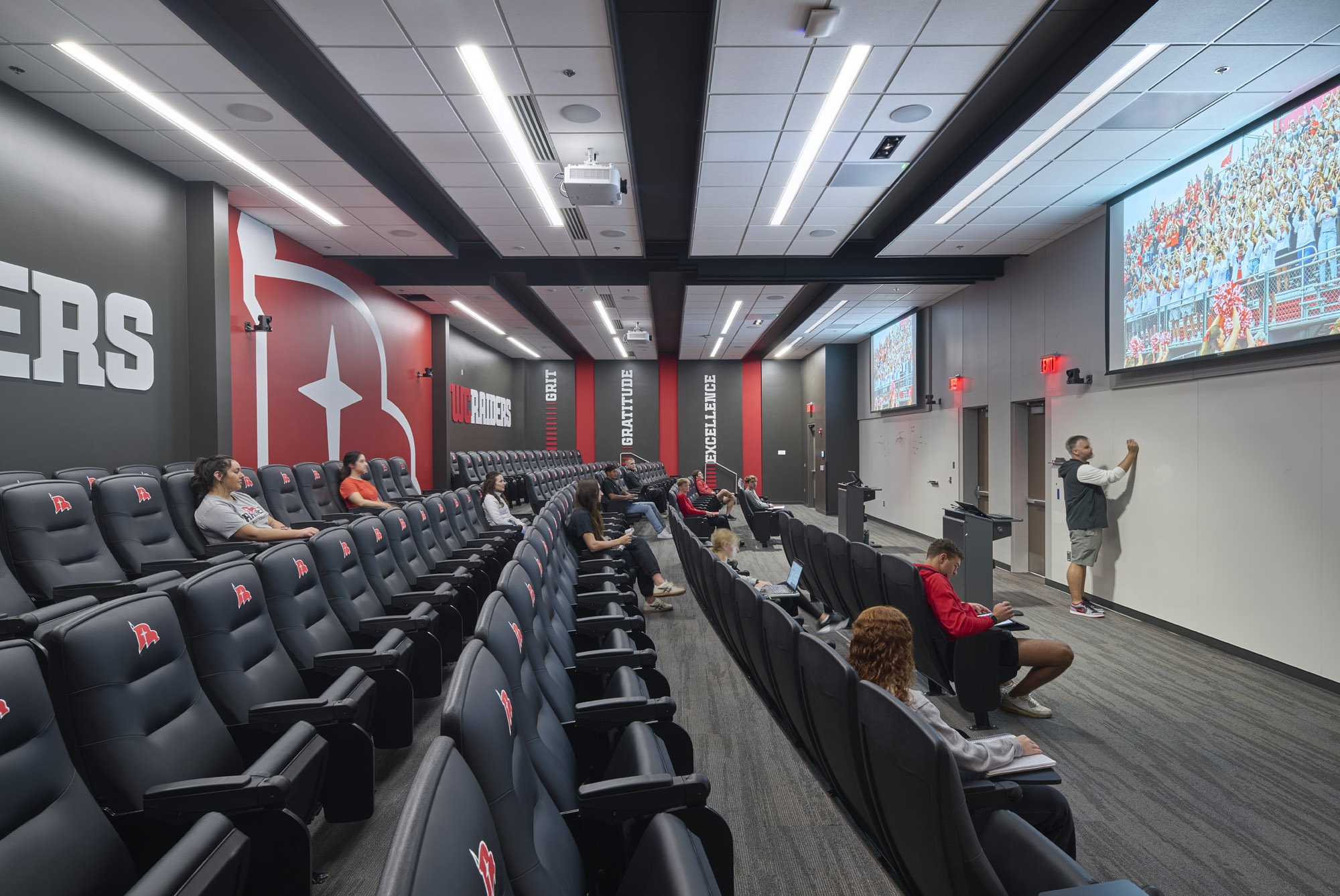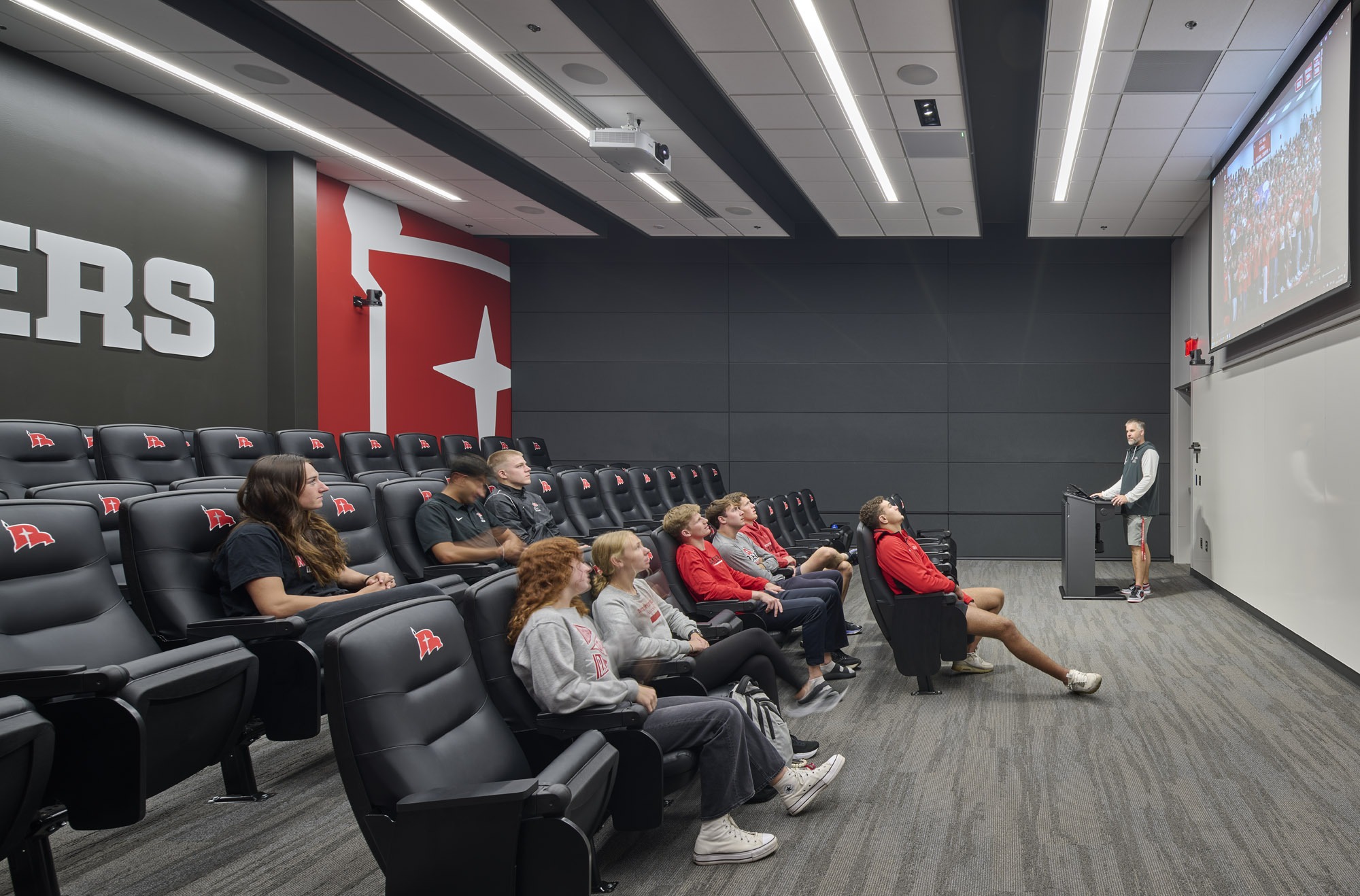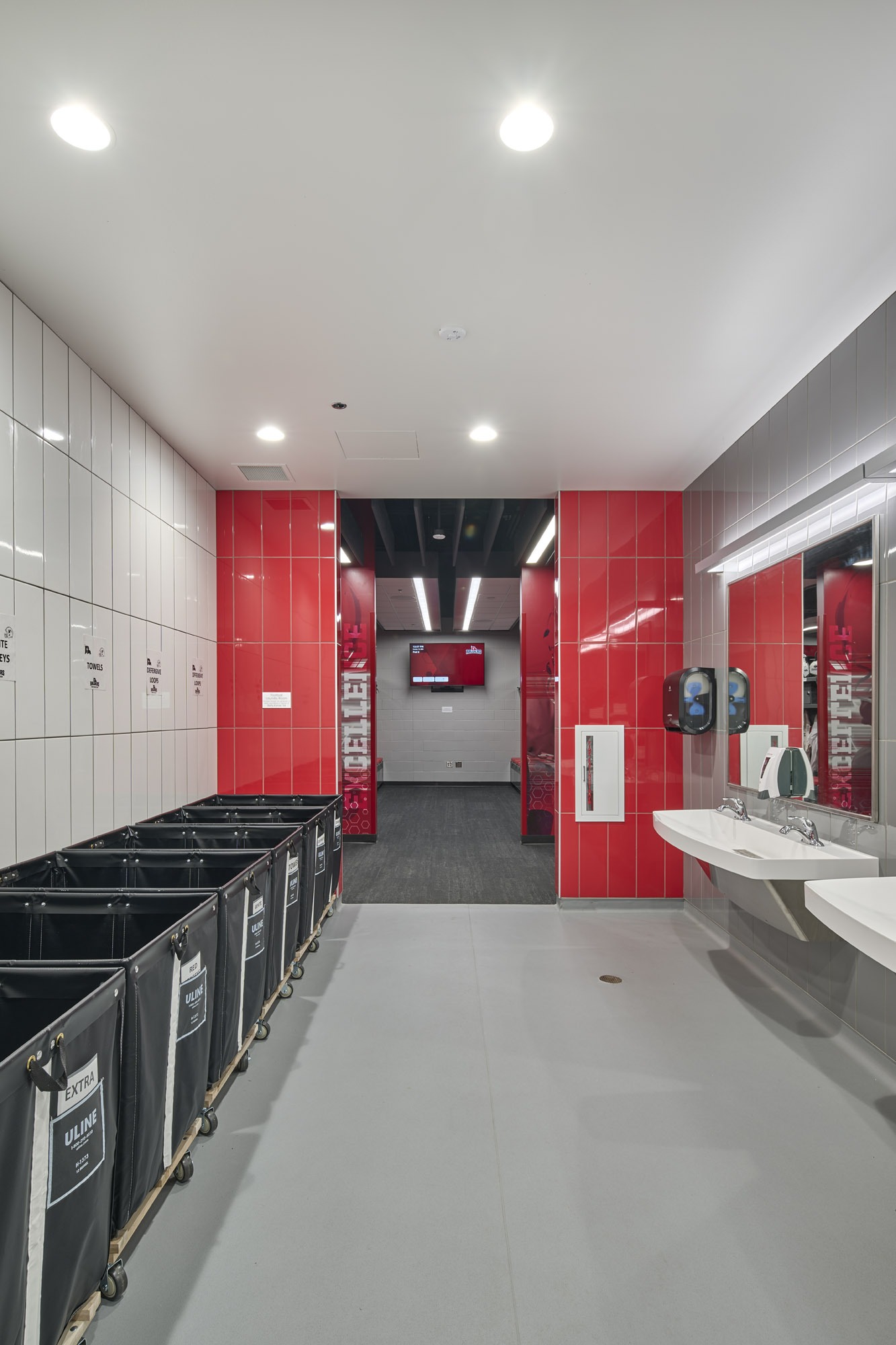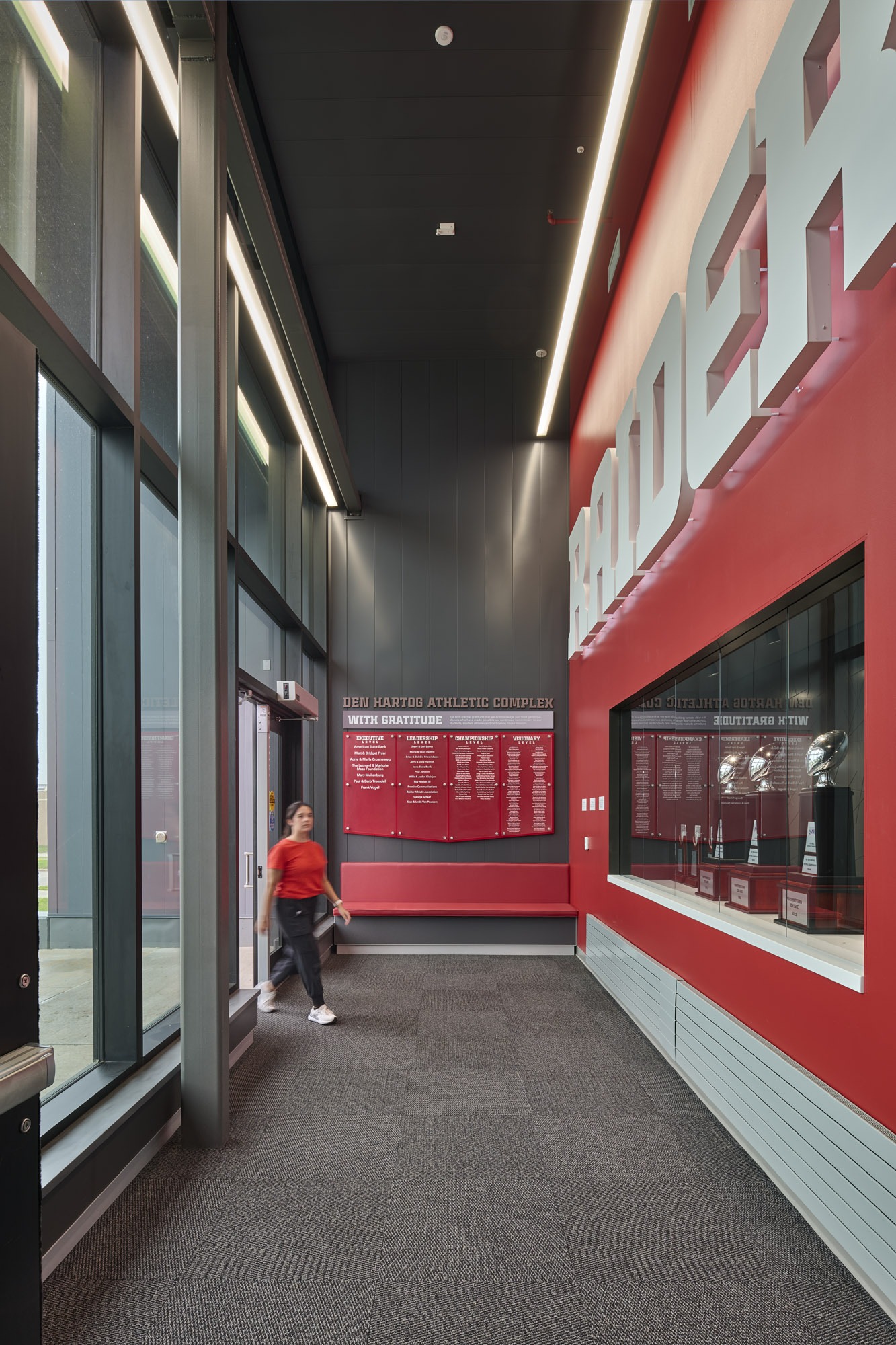 The building addition houses the football locker room, team room, and football coaching suite. Renovated spaces include basketball, soccer, softball, baseball, and volleyball locker rooms as well as the creation of a visitor changing room and finish upgrades to the athletic training room. The design solution focuses on efficiency of space utilization while showcasing the Raider identity throughout the project with vivid graphics and signage. The expanded and updated spaces provide each student athlete with a dedicated locker and home locker room, strengthen the recruiting process, support coaching and staff needs, and illustrate Northwestern College’s devotion to the student experience.