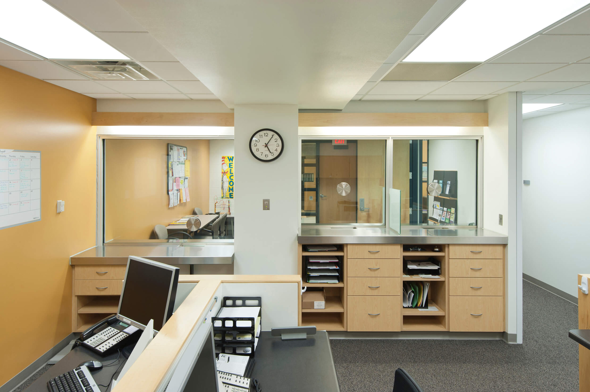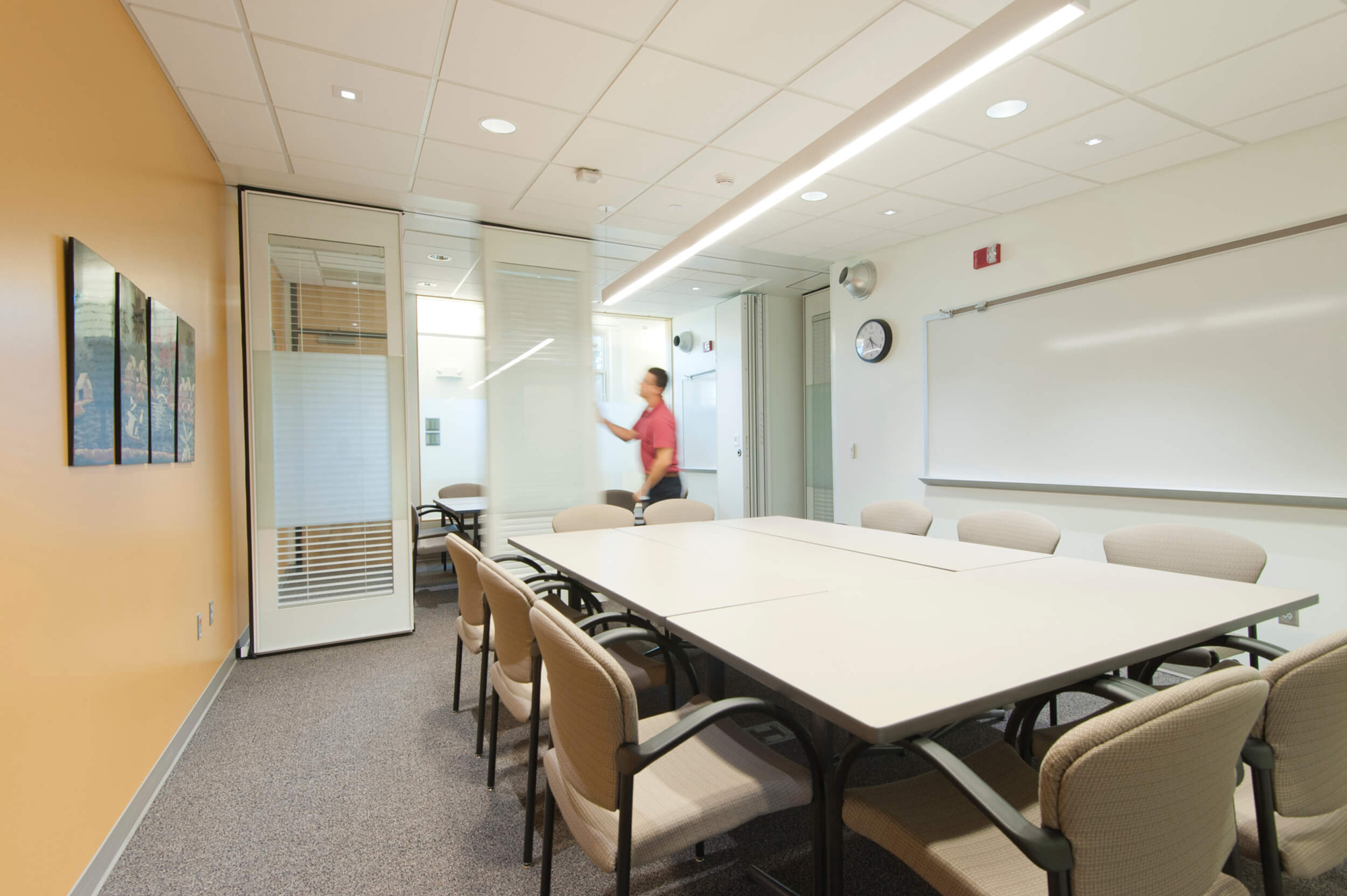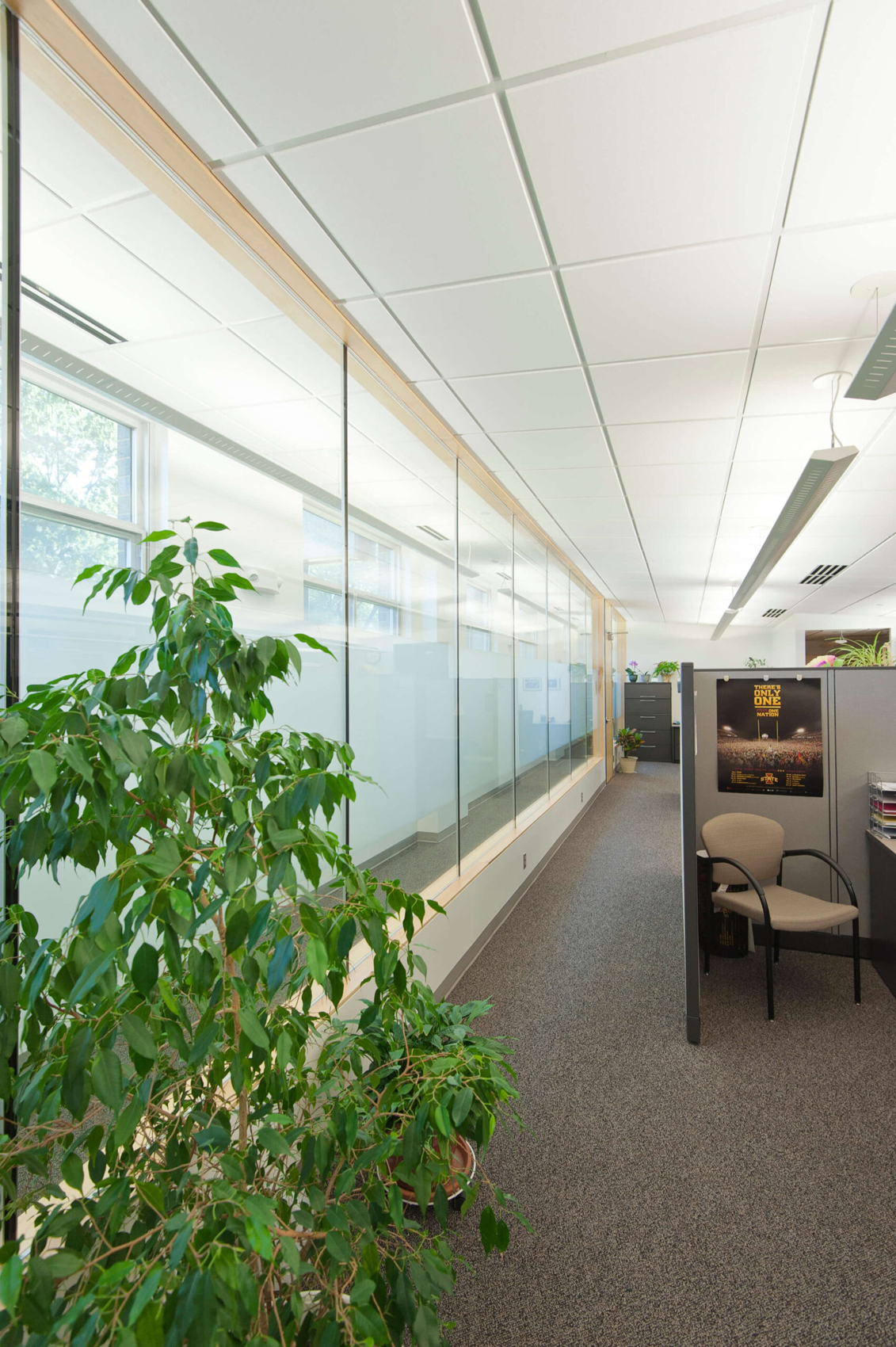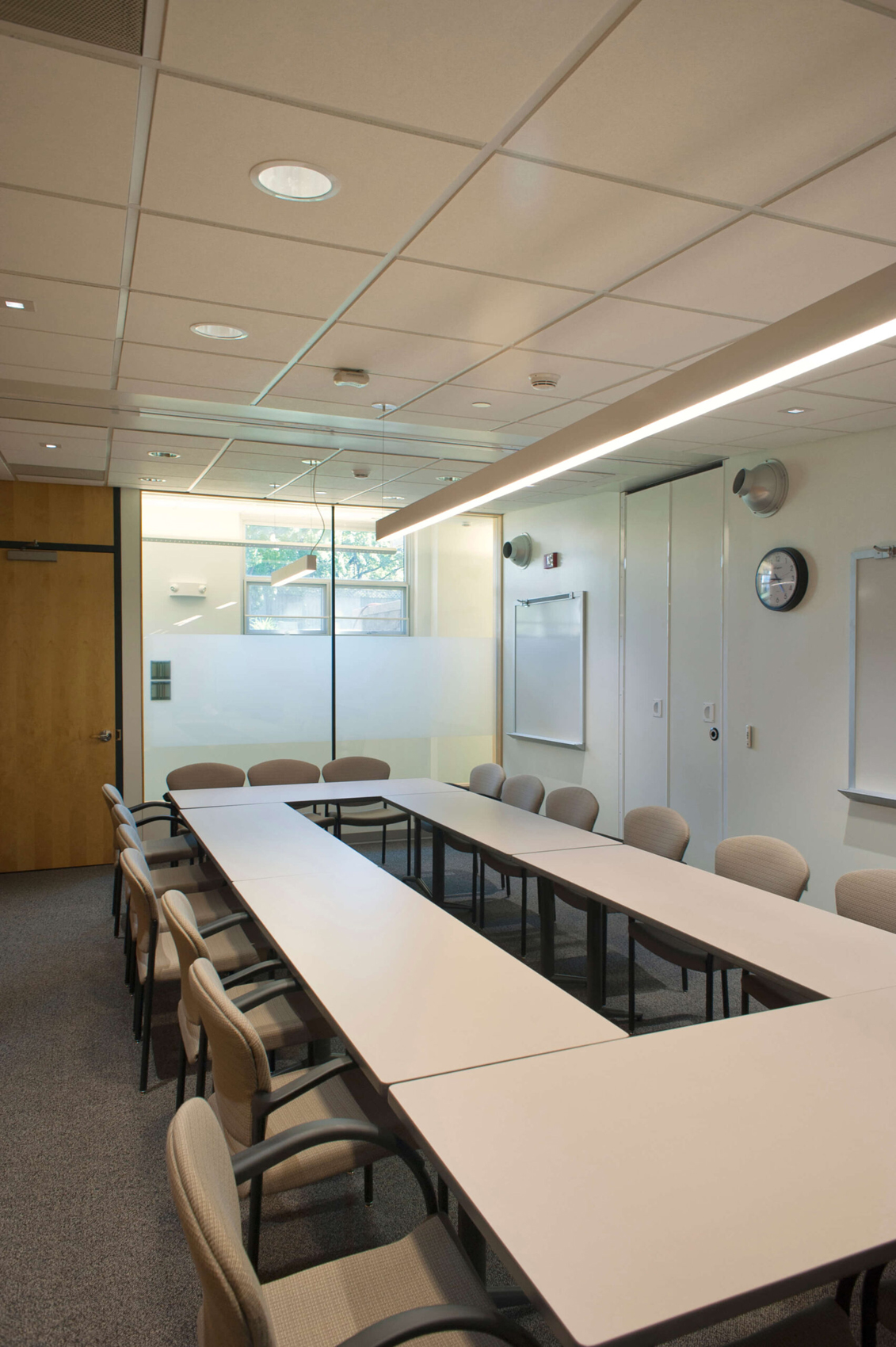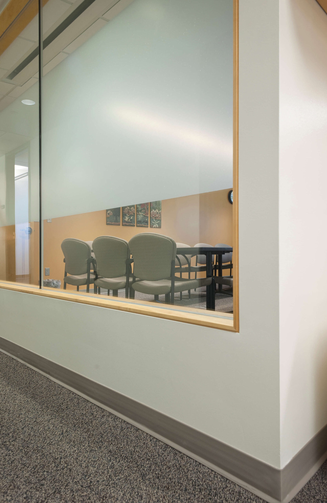 The department also desired multiple types and scales of conferencing abilities, from large staff meetings of twenty people or more to small personal meetings with visitors of no more than two to three people. Having limited space for conferencing functions, the solution was to create a singular flexible conference space with an operable glass wall to bisect the room on the fly. When opened, the room can easily accommodate a large staff meeting. When closed, the operable glass wall divides the space into a medium and small sized conference room. Private offices were also designed to provide impromptu meetings and conferences with visitors.